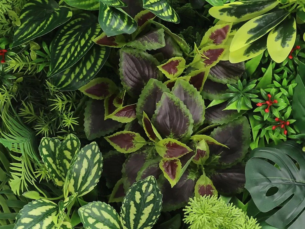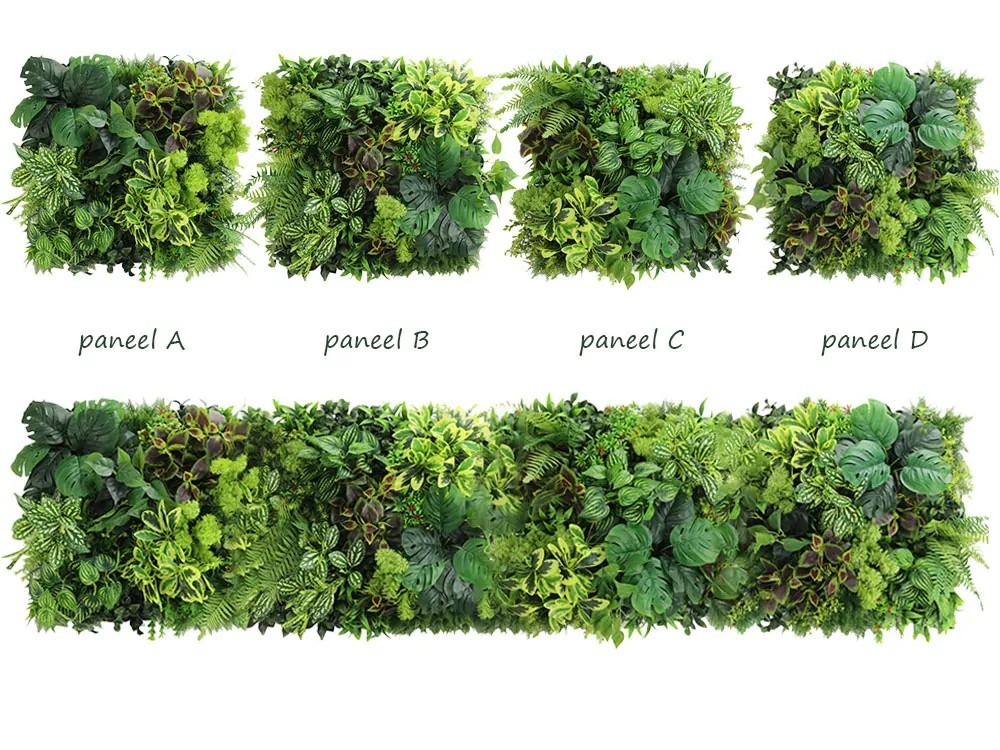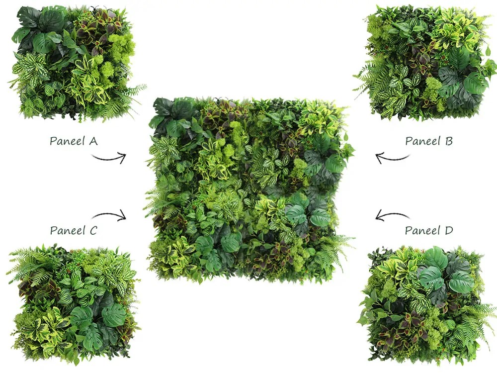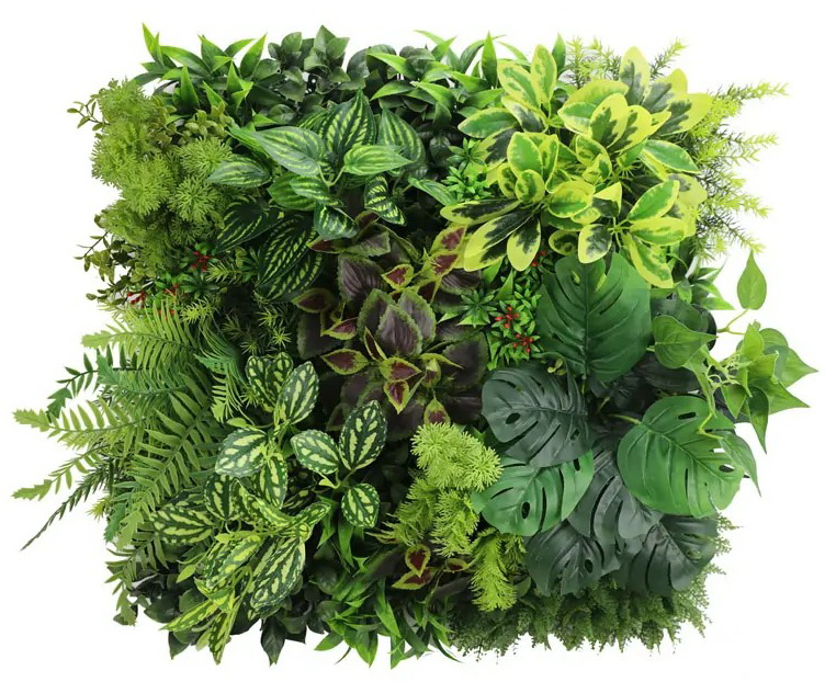 Umělá živá stěna EUONYMUS LUXE s mixem rostlin je vyráběna v luxusní kvalitě s nejrealističtějším designem. Oproti jiným modelům má rostliny z prémiových materiálů s důrazem na auutentičnost a je také více do prostoru, až cca 20cm. Zelená stěna je dodáván jako propojitelný dílec 50x50cm v celkové ploše 0,25m2. Dílce lze jednoduše upravit nůžkami, nebo štípačkami na požadovaný rozměr. Dílce se spojují pomocí integrovaných otvorů a příchytek, lze tak vytvořit nekonečně velkou na sebe navazující plochu. Nosná kostra je tvořena plastovým rastrem. Velmi snadná instalace. Materiál listů: PE. Dekorativní část umělé zelené stěny tvoří mix různých rostlin. Mnoho velikostí, tvarů a barev zajišťuje vysokou realističnost. dokonale tak imitují skutečné rostoucí živé stěny. Rozložení listů je pohledově jednostranné.  Vhodné pro vytvoření plotů, ale také také jako dekorace do komerčních prostor, hotelů, restaurací, ale i bytů a domů. Díky této živé stěně vytvoříte snadno vertikální zahradu. Cena za 1ks 50x50cm. Vyrábí se ve 4 provedeních A, B, C, D při objednávce nelze zvolit konkrétní typ, bude odeslán náhodný mix.
