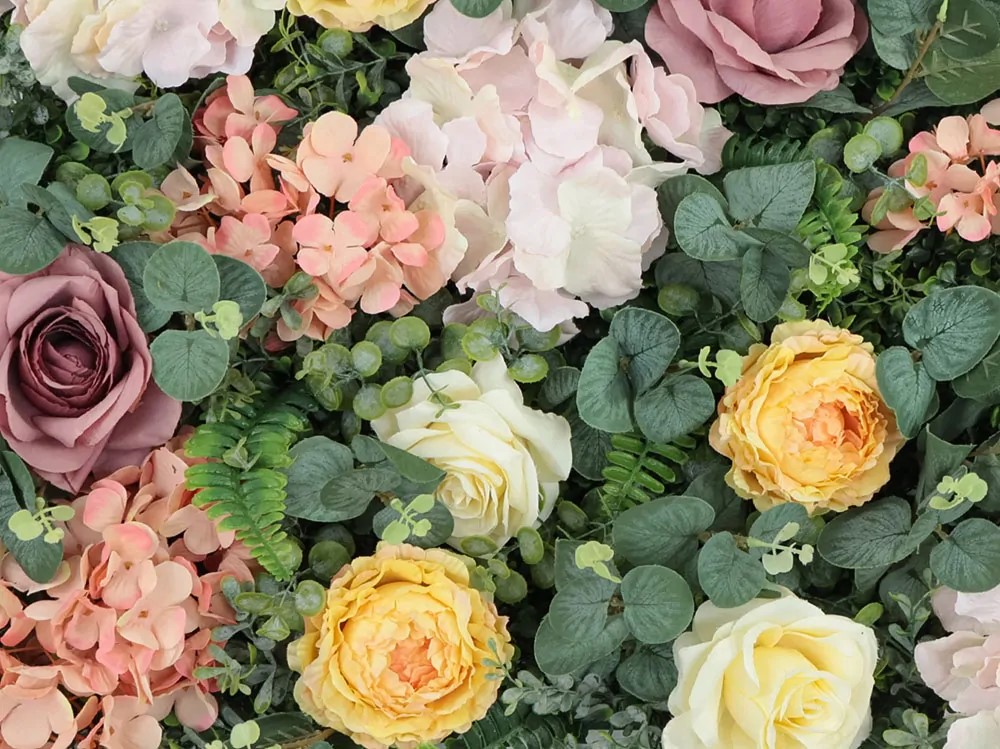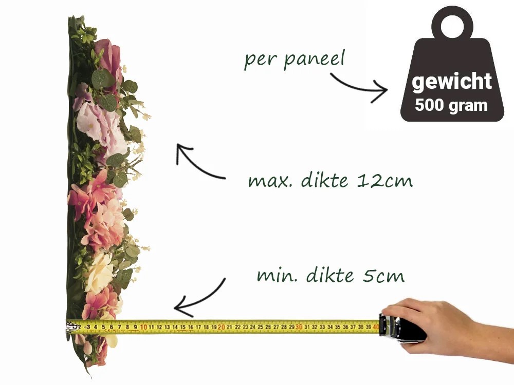 Umělý živá zelená stěna z nádherných květů růže a mixu dalších květin. Panel je velký 50x50cm a na zadní strěně je opatřen plastovou mřížkou pro snadnou montáž přímo na zeď. Panely lze spojovat bez viditelných spojů do nekonečného rozměru. Dílce lze jednoduše upravit nůžkami, nebo štípačkami na požadovaný rozměr. Dílce se spojují pomocí integrovaných otvorů a příchytek, lze tak vytvořit nekonečně velký na sebe navazující obrazec. Květy a lístky mají různou velikost a různé odstíny zelené. Použí pouze v interiérech.