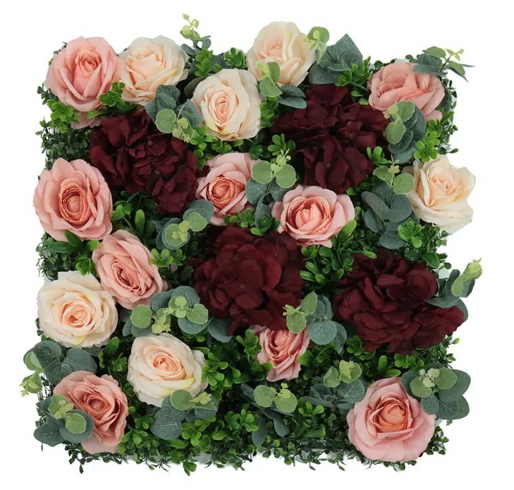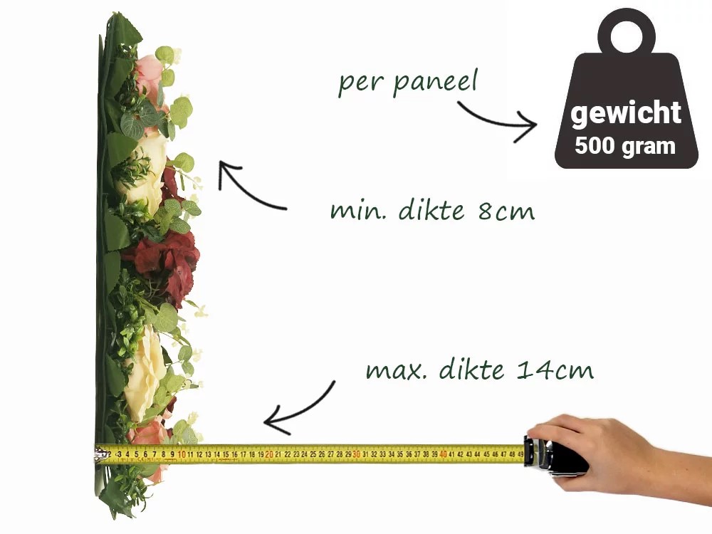 Umělý živá zelená stěna z nádherných květů růže a mixu dalších květin. Panel je velký 50x50cm a na zadní strěně je opatřen plastovou mřížkou pro snadnou montáž přímo na zeď. Panely lze spojovat bez viditelných spojů do nekonečného rozměru. Dílce lze jednoduše upravit nůžkami, nebo štípačkami na požadovaný rozměr. Dílce se spojují pomocí integrovaných otvorů a příchytek, lze tak vytvořit nekonečně velký na sebe navazující obrazec. Květy a lístky mají různou velikost a různé odstíny zelené. Použí pouze v interiérech.
