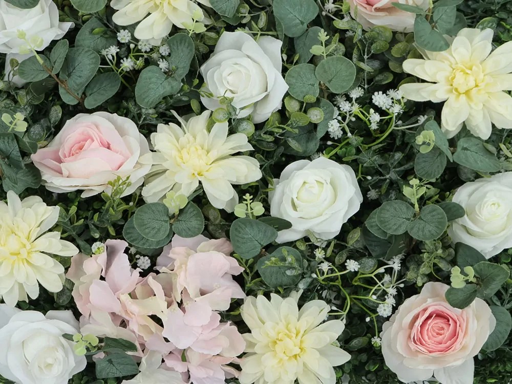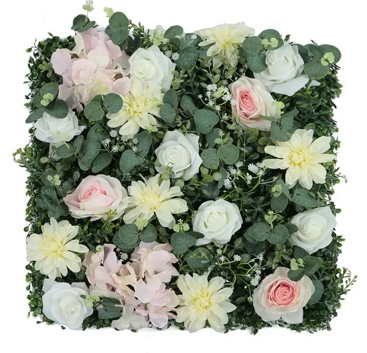 Umělý živá zelená stěna z nádherných květů růže a mixu dalších květin. Panel je velký 50x50cm a na zadní strěně je opatřen plastovou mřížkou pro snadnou montáž přímo na zeď. Panely lze spojovat bez viditelných spojů do nekonečného rozměru. Dílce lze jednoduše upravit nůžkami, nebo štípačkami na požadovaný rozměr. Dílce se spojují pomocí integrovaných otvorů a příchytek, lze tak vytvořit nekonečně velký na sebe navazující obrazec. Květy a lístky mají různou velikost a různé odstíny zelené. Použí pouze v interiérech.